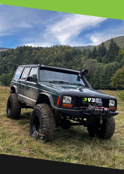 Jeep pregătit pentru orice provocare: Cherokee XJ, echipat și modificat special pentru offroad, asigură siguranța și confortul tău în orice condiții de teren.